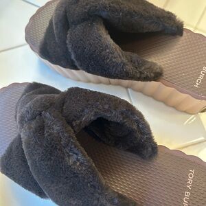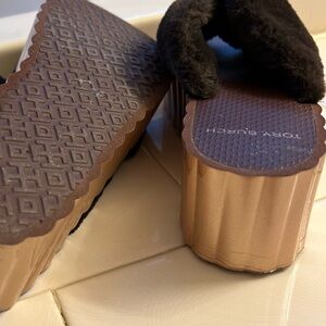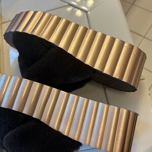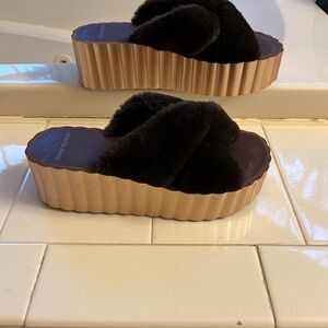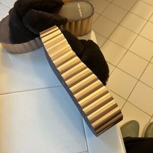 Funky and comfortable slides . Color brown furry material with really trendy soles. Gold and edgy..