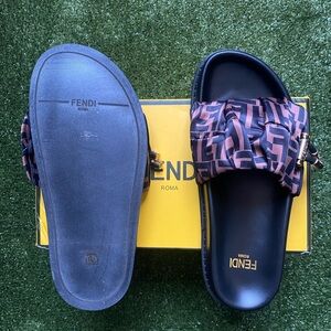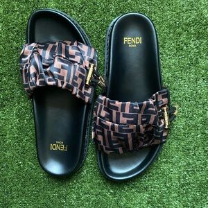 Stylish Fendi slide sandals in black and brown. Features iconic logo design.