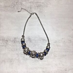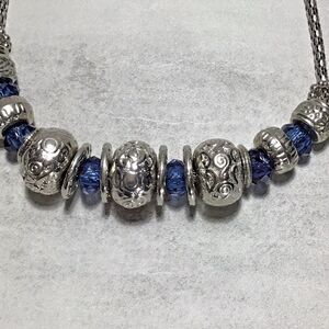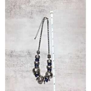 Sliding Beaded Necklace Chunky Bib Blue Faceted Silver Tone Mesh Chain 18.5"
