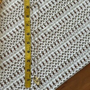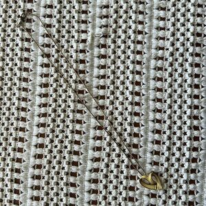 This gold tone vintage Monet necklace has a sliding open heart pendant on a dainty Foxtail link chain. The open heart pendant has a cream yellow enameling on the inside with gold tone borders. Pendant width is 3/4 inch. Pendant height is 1 inch.