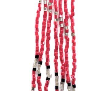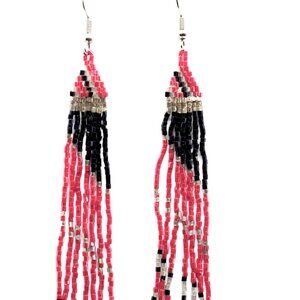 These striking handwoven seed bead fringe earrings feature #15 seed beads in coral, silver, and hematite, intricately woven in a diagonal pattern for bold visual impact. The top portion is crafted using a peyote weave, creating a structured base from which six free-hanging beaded strands flow with dramatic movement.