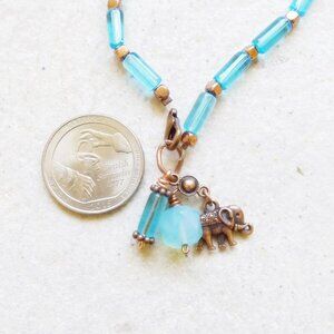 For elephant 🐘 lovers! Made with aqua glass rods, spaced by copper colored cube beads. Securely closes with a lobster claw clasp.