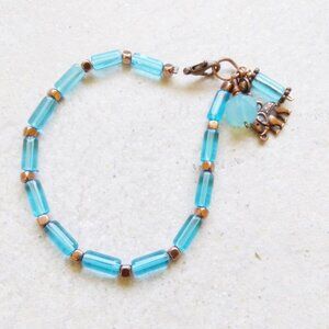 For elephant 🐘 lovers! Made with aqua glass rods, spaced by copper colored cube beads. Securely closes with a lobster claw clasp.