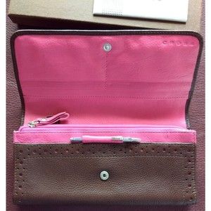 Cross Full Grain Pebbled Leather Women's Slim Envelope Wallet Clutch in a gorgeous Rich Chocolate Brown and Bright Pink with a mini Cross pen. Wallet interior is pink leather and Cross Logo fabric.