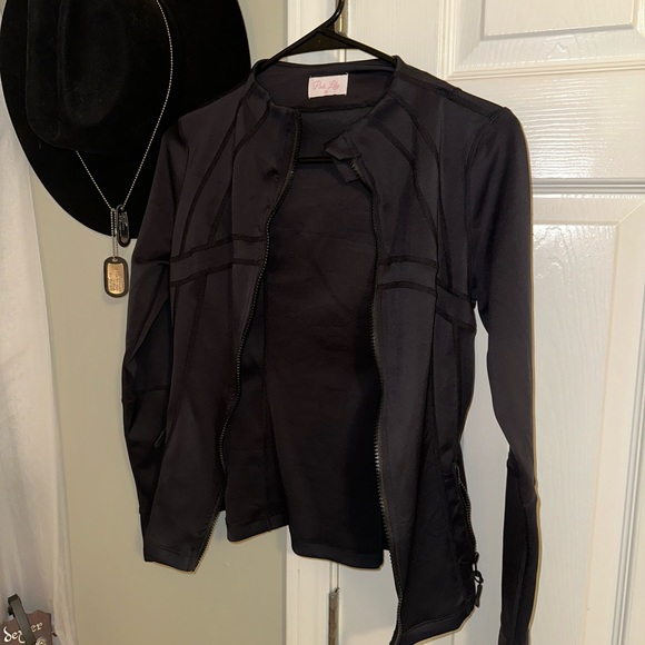 Black slim fit workout jacket. Size M but fits like XS. Too tight on arms for me. Would be good for teenager. Never worn