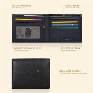 Bifold wallet has a slim and compact design but has plenty of room. It just measures 4.35 x 3.5 inches and can still hold 4 Credit Cards, 1 ID Card, 2 Document and Currency Compartment for you.