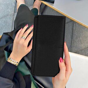 Features: This minimalist long wallet is crafted from smooth PU leather, featuring a classic solid black look. It has 8 compartments including card slots, a transparent ID window, and cash pockets—perfect for organizing your essentials without bulk. The snap closure keeps everything secure, while the ultra-thin design makes it easy to carry in your purse or pocket.