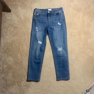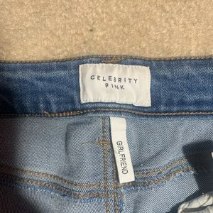 - super cute and trendy girlfriend jeans in a slim straight fit with small rips near the knees