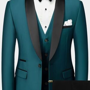 Black handkerchief included! Worn once. Four internal pockets. Stylish teal tuxedo jacket featuring black accents. Perfect for formal occasions. Pairs well with black or teal suit pants. Fits slim, ideal for someone with smaller proportions who struggles to fit into regular adult sizes.
