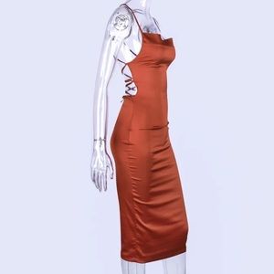 Very sexy and sleek spaghetti strapped dress with tying crossed back. Color is a glazing burnt peach. Very slim fitting to the body.