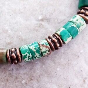 Made with green Sea Sediment Jasper Heishi Beads, embossed copper rings, and a single, chubby, fat copper statement bead.