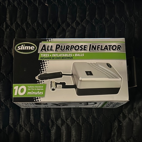 Slime all purpose inflator for tires and inflatables. Compact and efficient. Black and silver design.