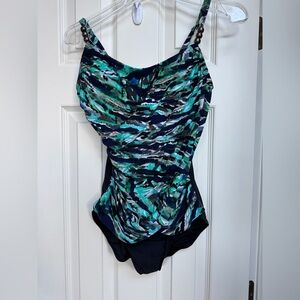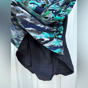 Stylish teal, blue and black ruched swimsuit. Adjustable straps, full coverage bottom and slight draped front. Cute bead detail on straps. Padded support.