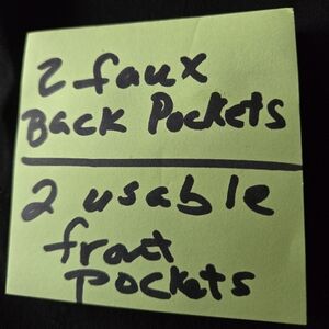 Details: 2 functional front pockets, 2 faux back pockets
