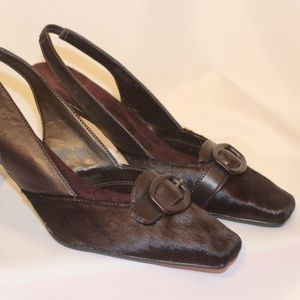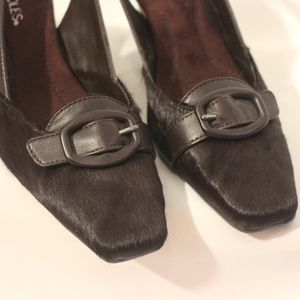A unique pair of Aerosoles! A rich, chocolate brown with burgundy under tone. Leather and hide upper. Great for the office with a pencil skirt or ankle length pants along with dresses. Labeled style: Groovy. 9M - slightly narrow. Like new, rarely worn.