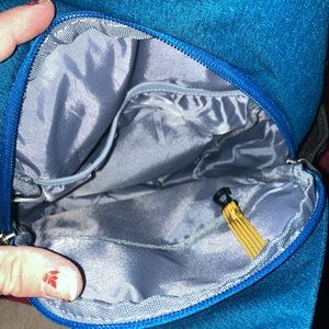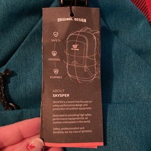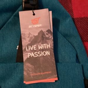 Sling backpack by Skysper. Has multiple pockets on front and inside. Has two elastic pockets on sides. Has a pocket on strap which is adjustable. Perfect for school or outdoor activities.