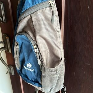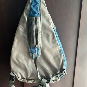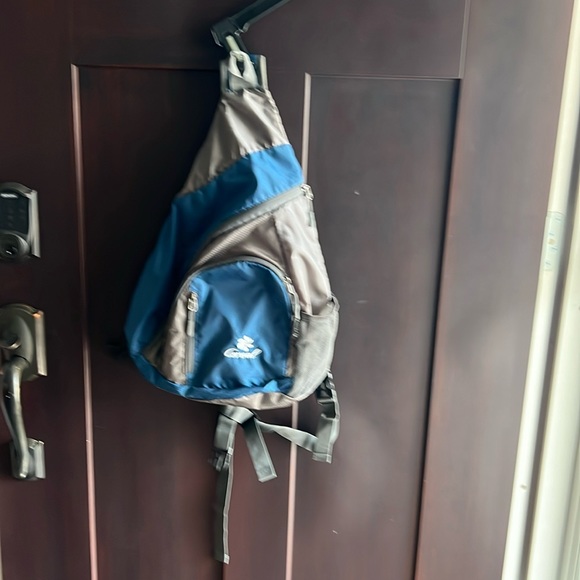 Like new one shoulder sling back pack, adjustable. Used once. Has a bottle spot, padded one shoulder strap in blue and grey.