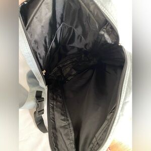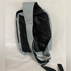 Gray sling backpack. 2 pockets, adjustable strap. Both pockets open all the way up, with double zippers. Good used condition.