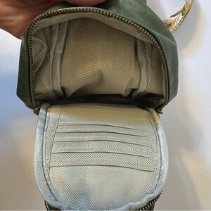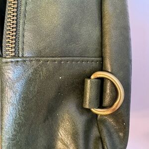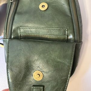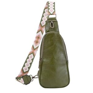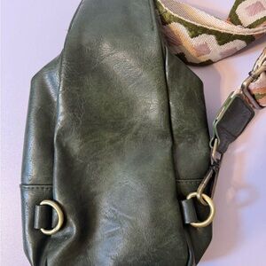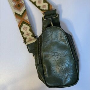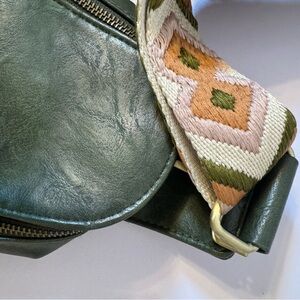 Stylish green leather crossbody bag. Features a colorful patterned strap with green, pink, and tan accents.