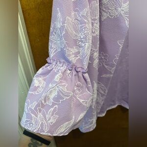 Super cute purple open front cardigan/jacket blouse in a size 1x by Slinky brand with white floral pattern and ruffled sleeves in great preowned condition