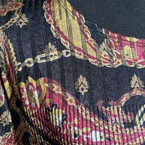 Slinky Brand top has a asymmetrical hem in a slinky fabric with paisley/geometric print of black/red/gold colors, also has stripes