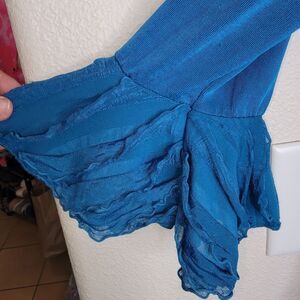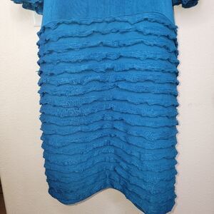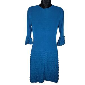 Excellent pre-owned condition. Women's Slinky Knit Brand Turquoise Blue Tiered Ruffled Bell Sleeve Dress Size Xs.