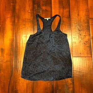 Deep blue & black racer back tank top with silver beaded detail around top & pocket edges.