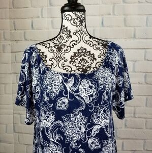 This is a women's stretch knit short sleeve floral print top that comes in a size medium