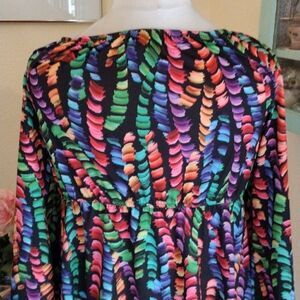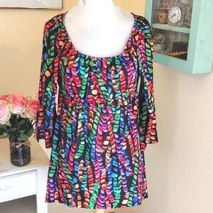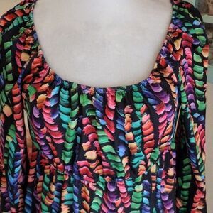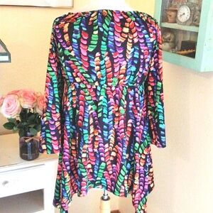 Fun top with a hem that is longer on the sides. Elastic at neck and under chest. Bell shaped raglan sleeves. Size M measures 40 at chest, 34-42 under chest. 54 at hips. 27-36 long from shoulder to hem. Great with everything.