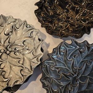 Used to make the pottery plates like the 3 from the photo. 3D textures with leaves and holly seeds. Beautiful design for nature lovers or holiday festivities.