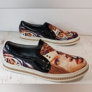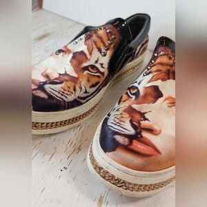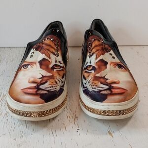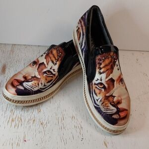 Slip On Loafer Canvas Face Tiger Print Silver Studs Size 11