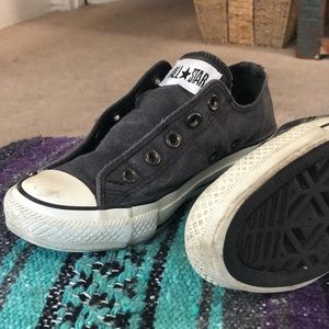 Cute used 3/5 times converse slip on , no lace up needed. Color is like a wash black