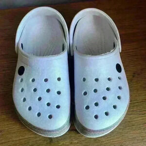 "Croc" style little girl shoes. Cute rainbow glitter detail along the bottom edge. Shoes are white with black accents. My daughter wore these to and from ballet class last year. Still in great shape!