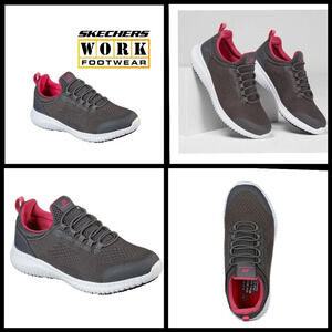 Refined sporty style and all-day protected comfort combine in the Skechers Work Relaxed Fit®: Cessnock - Carrboro SR shoe. This slip-resistant sneaker features a smooth mesh knit upper with a slip-on bungee-laced front and cushioned Memory Foam insole.
