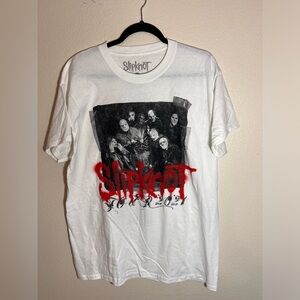 Official Slipknot 2021 tour tee featuring the full band graphic on the front and tour cities on the back. White shirt with bold red Slipknot spray-paint style logo and tribal “S” flame detail. Made from 100% cotton. Tag says Large. New without tags with one small stain on the right sleeve (see last photo). Priced accordingly.