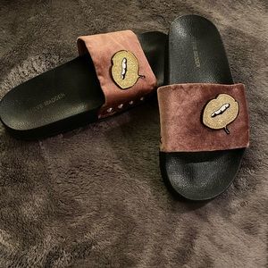 Steve Madden slip on, velvet tops, flexible bottoms. Very comfortable. Mauve color.