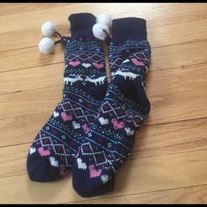 Warm, comfortable slipper socks with slip resistant bottoms. Cute pattern and pompoms!