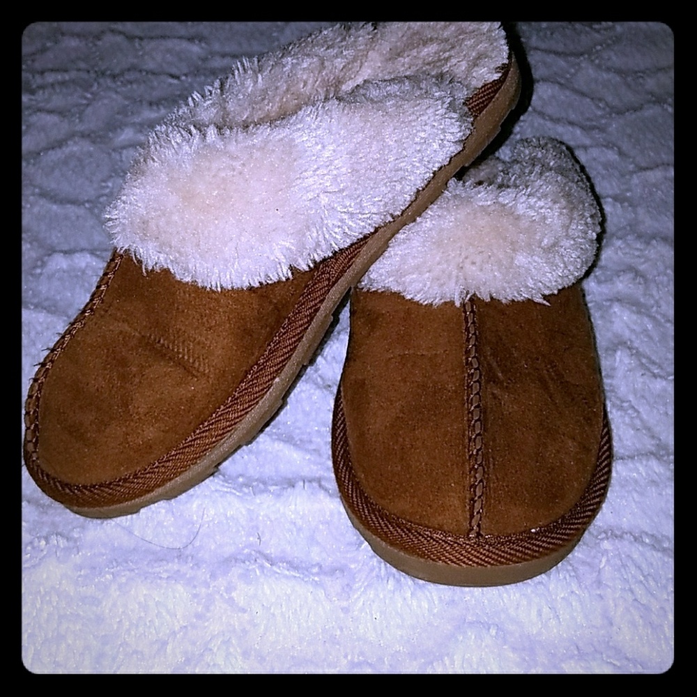 Like new girls fauz suede tan color slippers size small or 13-1 with hard soled bottom and fur type lining. Smoke free. Pet free home.