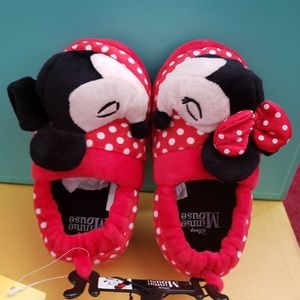 Adorable slip on slippers with polka dots and non slid sole. Minnie Mouse on one and Mickey mouse on the other.