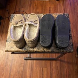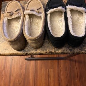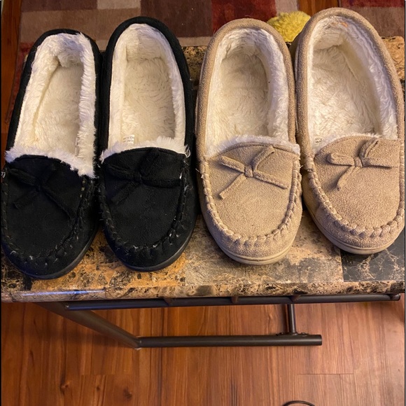 Slip on slippers. Ladies size 7 to 8 fabric upper, fux fur lining. Hard sole bottoms. One pair black and one pair beige. Ten dollars each.
