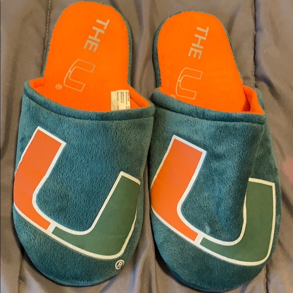Miami hurricanes slippers with orange inside and green on the front with a big Miami “U” on it. Worn twice only inside