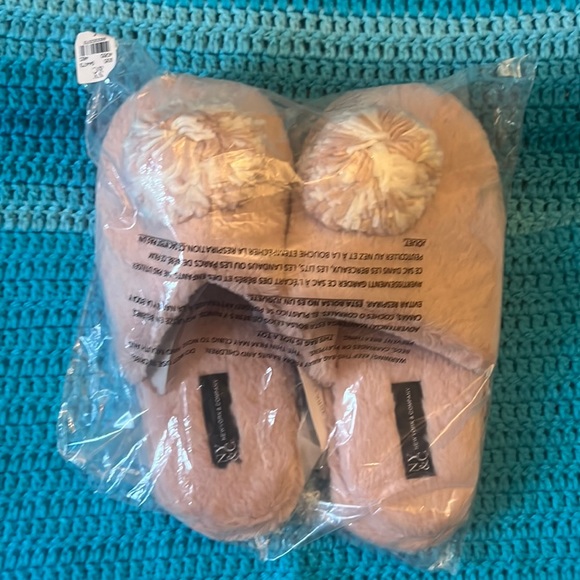These slippers are a size 7 New York and Co. Color is pink with pompoms