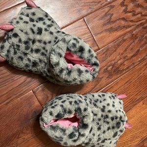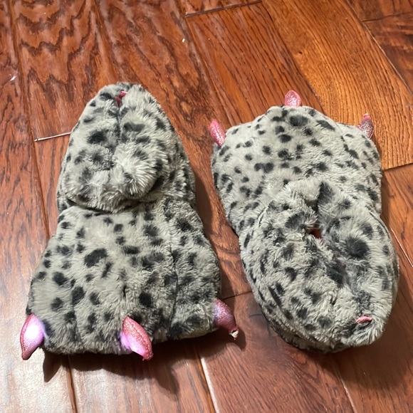 These are dinosaur slippers they are gray with black dots and pink toes they light up and have pink inside they are six and very comfortable