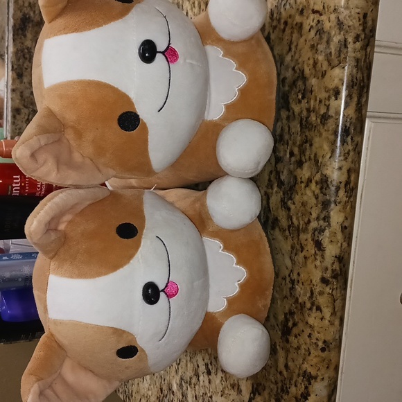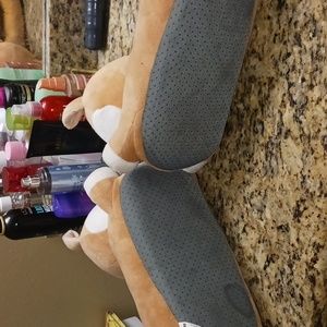 Cute slippers are one point were foot warmers as well but I lost the cords. Still are great slippers no tears or damage these are size 8-9 very comfy. Used a couple of times only, bottom of shoe is fairly clean one water spot on sole of slipper.