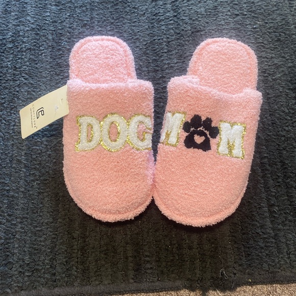 Women’s pink slippers with dog mom in white and black. S/M 6-7