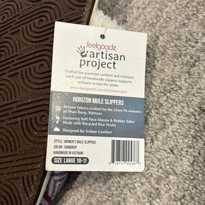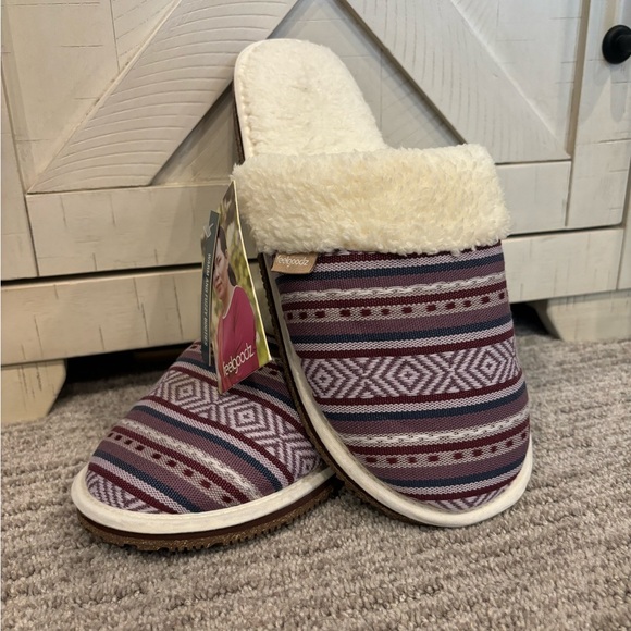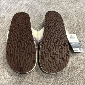 New with tags, fuzzy slide on slippers with purple design. Size Large 10-11