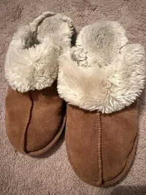 Soft brown suede-like exterior with plush cream faux-shearling cuff for warmth. Slip-on design for easy on and off. Comfortable padded sole for all-day wear and indoor play. Neutral brown and cream colors pair with many outfits.