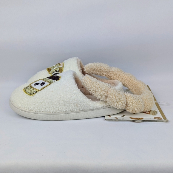 Slippers & Headband Coffee Croissant Sherpa Embroidery Sequin Ivory L (9/10) NWT