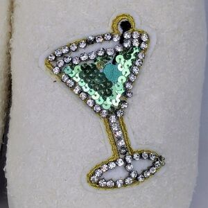SLIPPERS: Faux fur sherpa upper with martini and bottle detail (embroidered, rhinestones, sequined applique). Cushioned faux fleece footbed. EVA/rubber outsole.