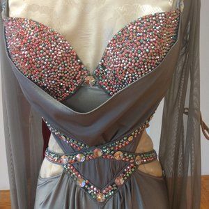 Custom JR Designs silver split skirt (pants) design sweetheart bust with decorated with rhinestones. Partial open back with straps across waist and hips. Long sheer sleeves, can attach to arms.